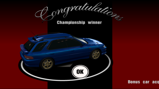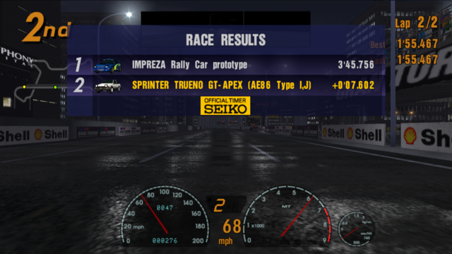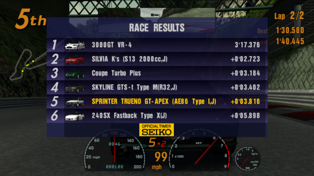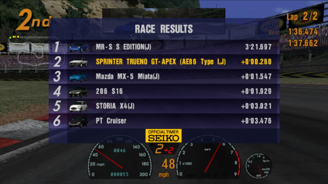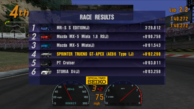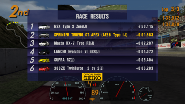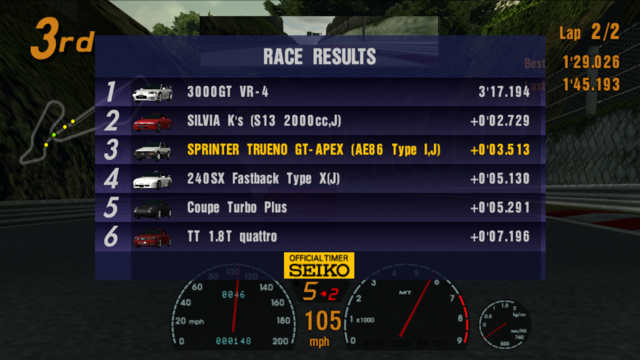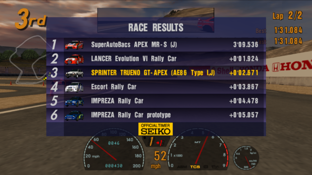 After selling the prize car - a Subaru Impreza Wagon - I now have enough to buy all the remaining upgrades and make another attempt at the Beginner League GT World Championship. The first two races go according to plan with two wins, but in the third race at Trial Mountain I come 5th. At least that's an improvement on last time, I guess? Unfortunately, I finish no higher than third in the rest of the championship, as the Toyota MR-S dominates the rest of the series, and I spin out too many times trying to keep up.