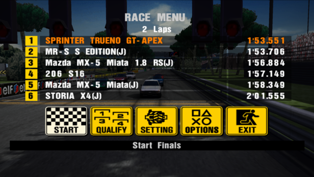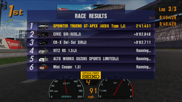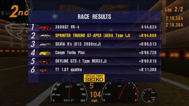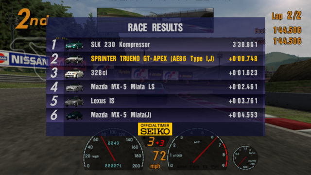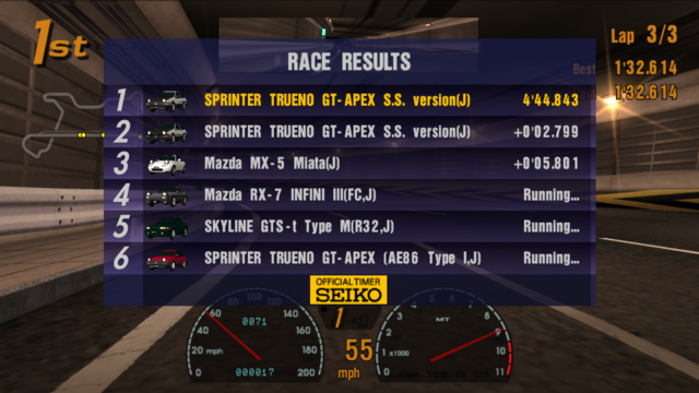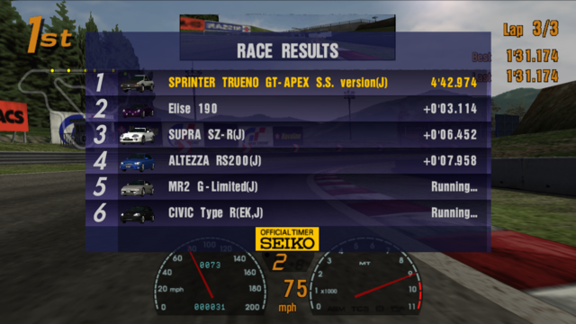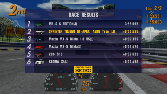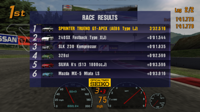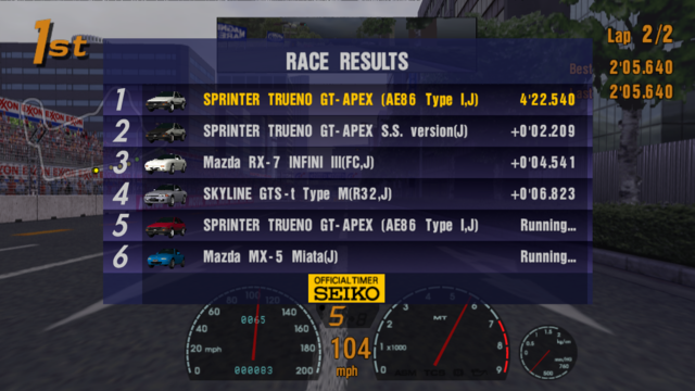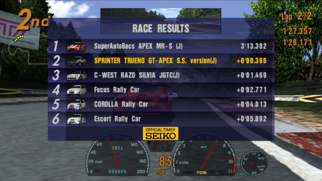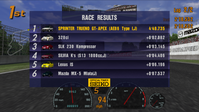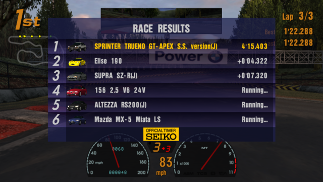 I'm off to a good start, as the first two races are won by overwhelming margins, but a mistake at Trial Mountain hands the win to the MR-S. But - although none of the subsequent races are as lop-sided as the first two, I win the lot of them to take the championship with races to spare.