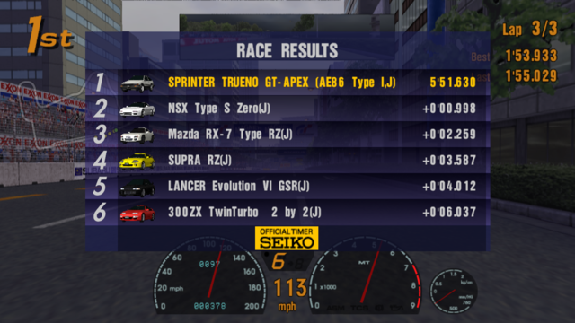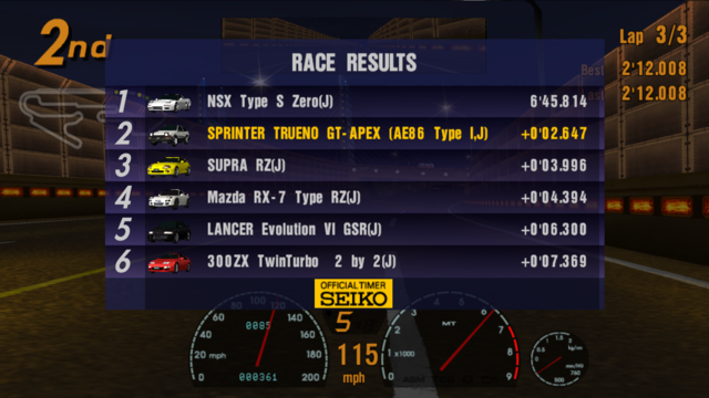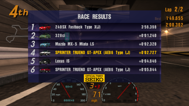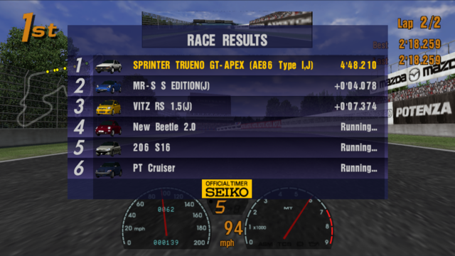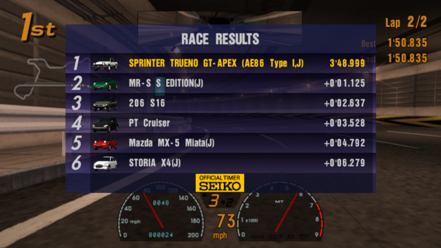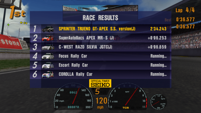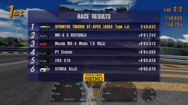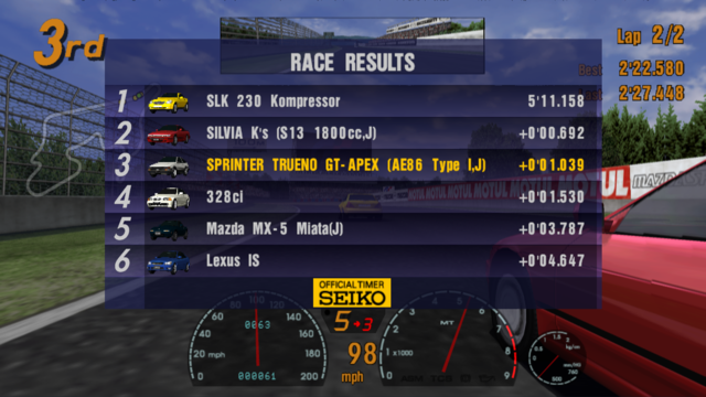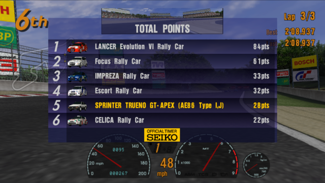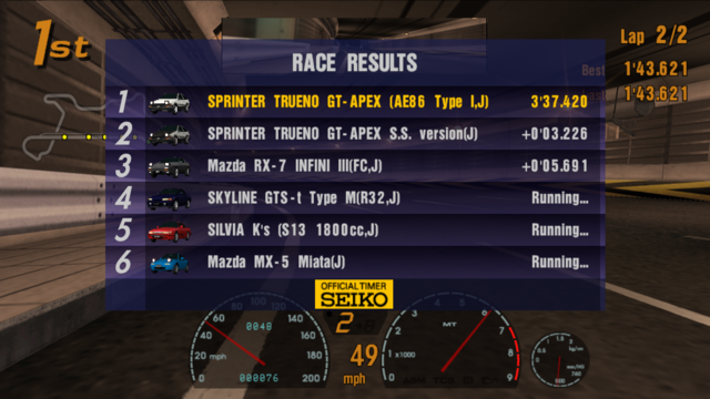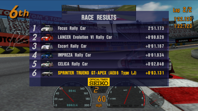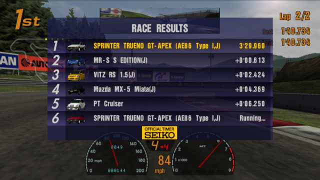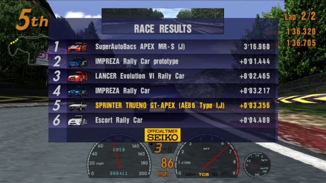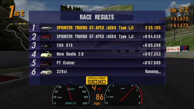 The obvious next step is Gran Turismo 4 - but the structure of that game's single-player campaign, with numerous different types of cars that need to be raced just to be able to attempt the GT World Championship in that game, is highly unfriendly to this kind of playthrough. There is an excellent mod of GT4, Spec II, that changes things about so that you can at least, in theory, attempt the GT World Championship without having driven anything other than an AE86 (and the license test cars, I guess). But good luck beating this championship without a top-class race car. So I doubt that I'll go ahead with this, but we'll see.