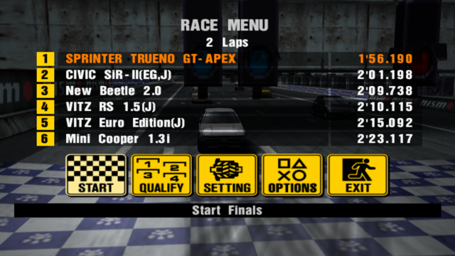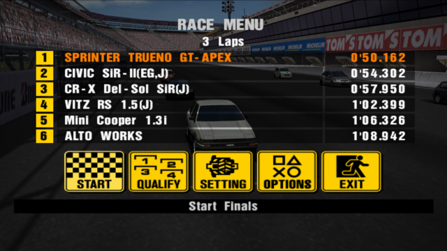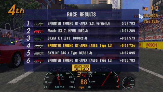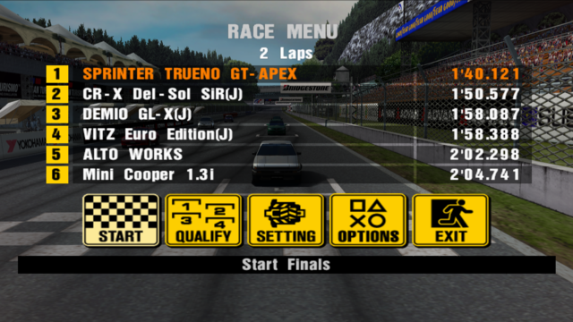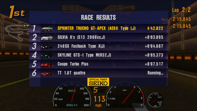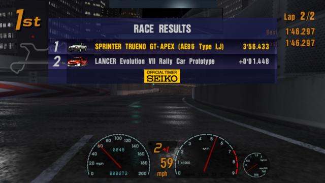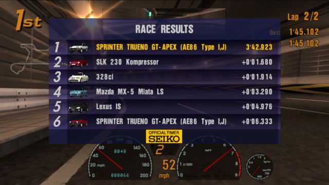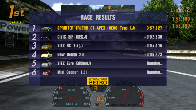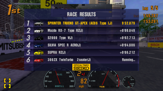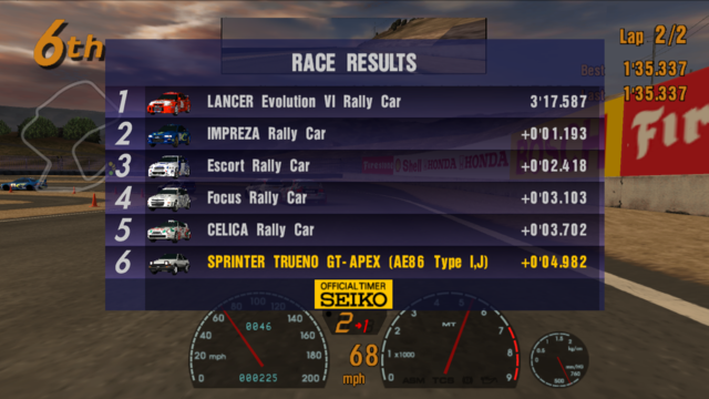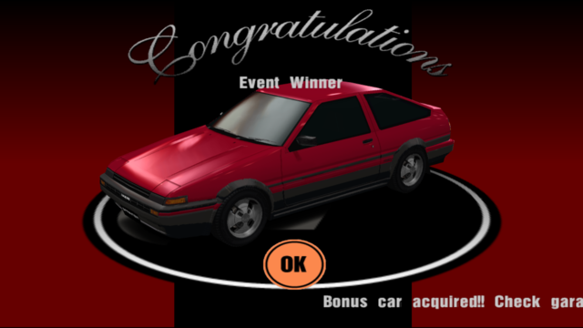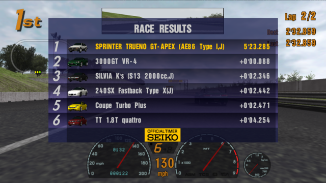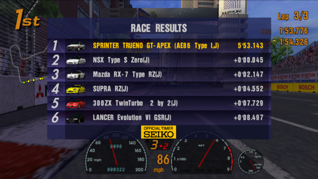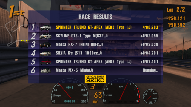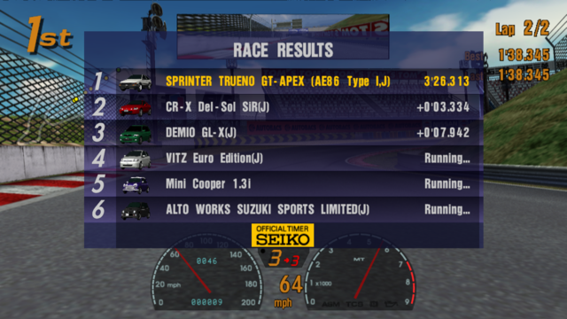 The obvious next step is Gran Turismo 4 - but the structure of that game's single-player campaign, with numerous different types of cars that need to be raced just to be able to attempt the GT World Championship in that game, is highly unfriendly to this kind of playthrough. There is an excellent mod of GT4, Spec II, that changes things about so that you can at least, in theory, attempt the GT World Championship without having driven anything other than an AE86 (and the license test cars, I guess). But good luck beating this championship without a top-class race car. So I doubt that I'll go ahead with this, but we'll see.