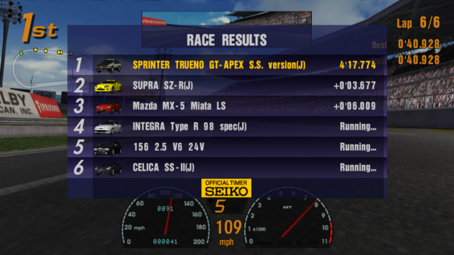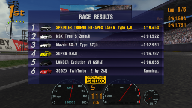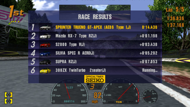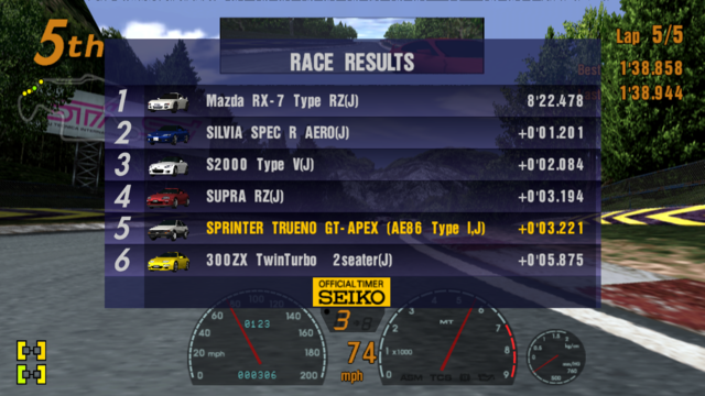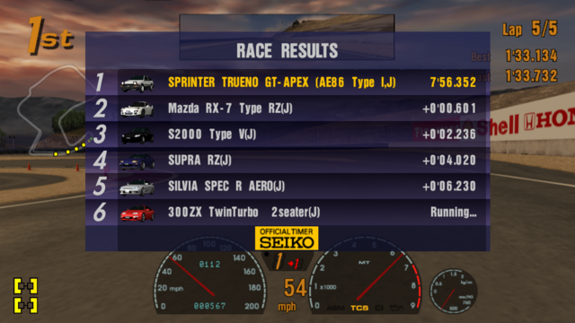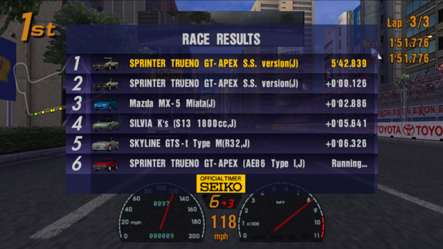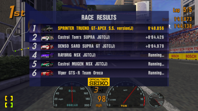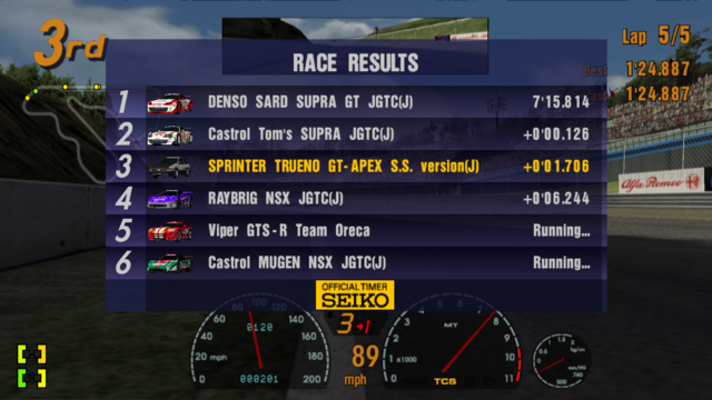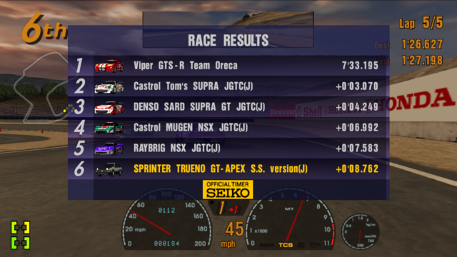 In qualifying, I put the car on the front row, but ominously, the Viper is over two seconds quicker. Sure enough, as the race starts, the Viper drives away from the field while I battle with the Supras and the Raybrig NSX for the first lap. But early in lap 2 I get clear of them and begin to chase down the Viper. Despite being the least powerful car on the grid, my AE86 has a surprising amount of straight-line speed, and early in lap 3 I get to within a second of the Viper. On lap 4, I overtake the Viper on the way into turn 1, but after I make a mistake at turn 5 (which Wolf Feather - a real authority on this era of racing games, and I hope he's doing well, whatever he's up to now - names "Sawa Bend" in his GT3 Tokyo R246 track guide, after the heroine of the anime Kite. For a while I thought "isn't that the Yasuomi Umetsu anime with the crazy bowling alley scene?" but it turns out that's from Mezzo Forte instead) the Viper regains the lead - only for it to pit for new tyres at the end of the lap, with just one lap to go. As a result, I end up winning the race comfortably, and it looks like a championship win is a genuine prospect. Race 2 at Laguna Seca is a different story, though, as the Viper wins on home tarmac while I finish last. Race 3 at Apricot Hill is somewhere in the middle, as the Denso Sard Supra comes out on top, while I finish third and the Castrol Tom's Supra takes a third consecutive second place.
