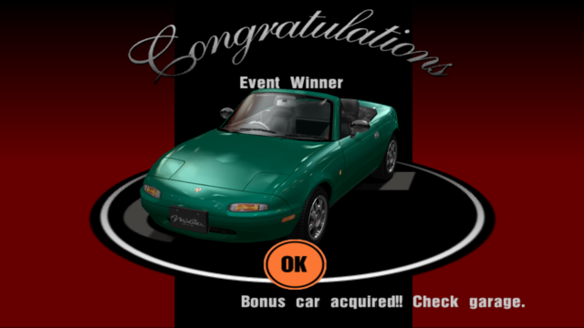 It's clear that even a fully-tuned car isn't going to be enough, but just like in GT2, there is a plan B. I go back to the Amateur League FR Challenge, and with the car having been upgraded since my previous attempt, I am able to win all three races. My reward is...
