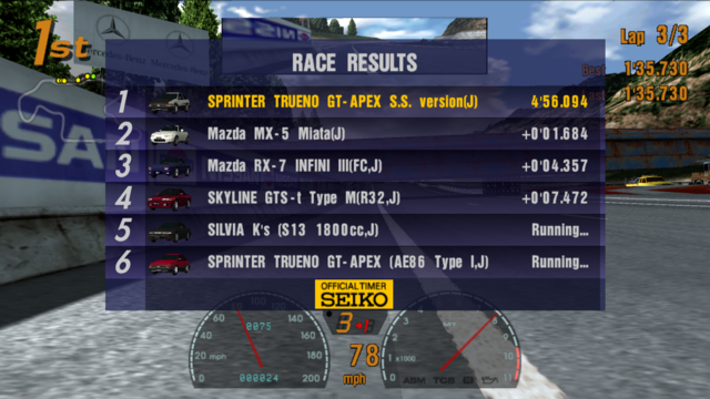 (Quick aside 2: And as I'm writing *this* part of the post, the race has been and gone - and the Initial D Mercedes was leading, until its race ended in a massive crash caused by some seriously dodgy marshalling and officiating, hospitalising driver Ralf Aron. Oops!)